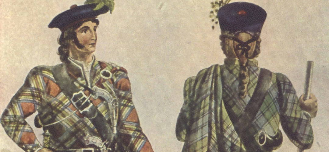 Historical illustration depicting Highland clansmen wearing early tartan dress, showing how tartan functioned as regional and clan identity in pre-modern Scotland.Clan Tartans - Patterns of Kinship